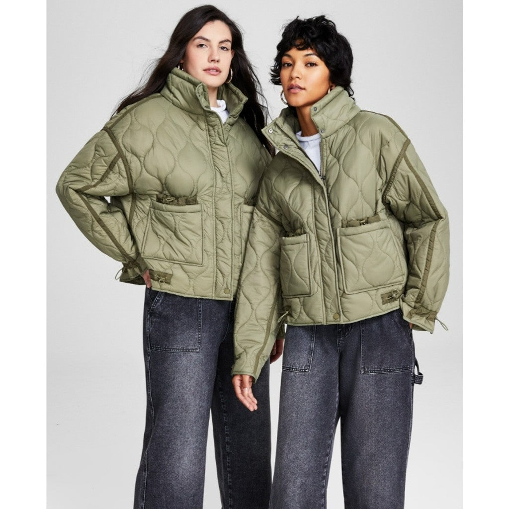 Stylish and cozy quilted jacket from And Now This in a crushed oregano green color. Features snap-button high collar, front zipper and snap closure, two front pockets, and adjustable drawstrings at hem and sleeves. Perfect for layering during cooler seasons.