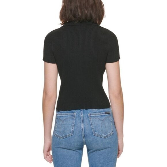 Calvin Klein Jeans Petite Medium Black Ribbed Polo Short Sleeve Shirt NWOT