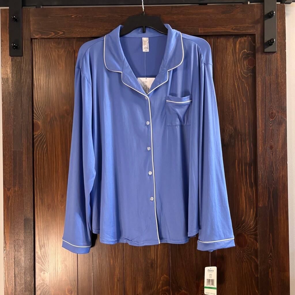 Flora Women's Size Large Blue Button-Down Pajama Top with White Piping NWT