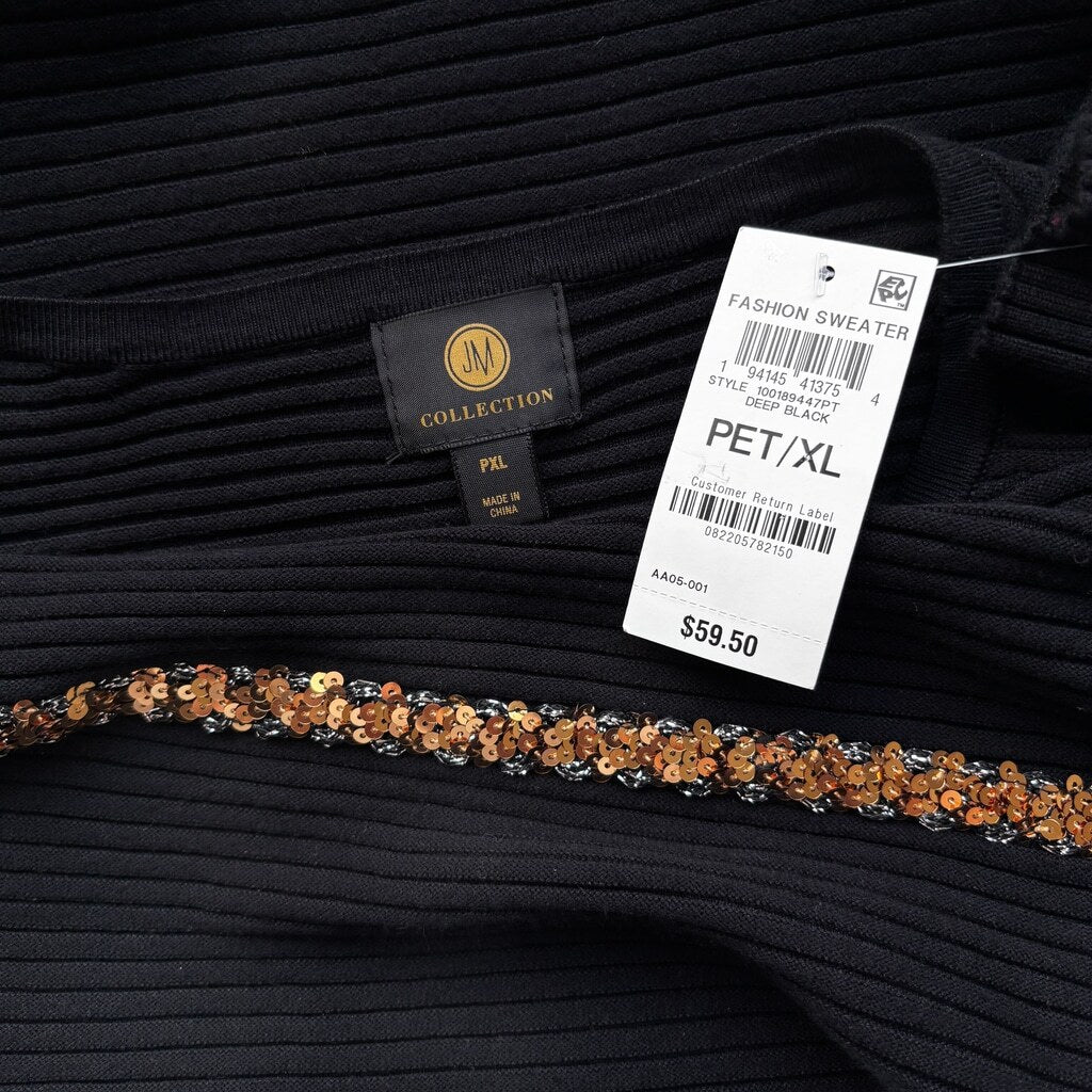 JM Collection Extra Large Petite Gold Sequined Stripe Black Ribbed Sweater NWT