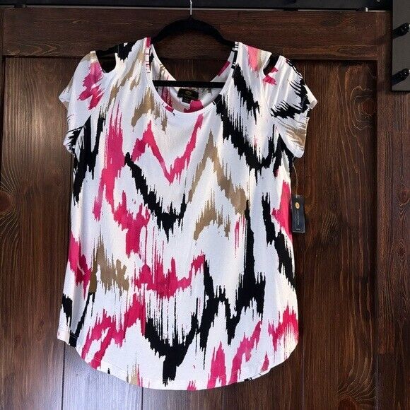JM Collection Petite Medium Cold-Shoulder Pink, White & Black Printed Top NWT