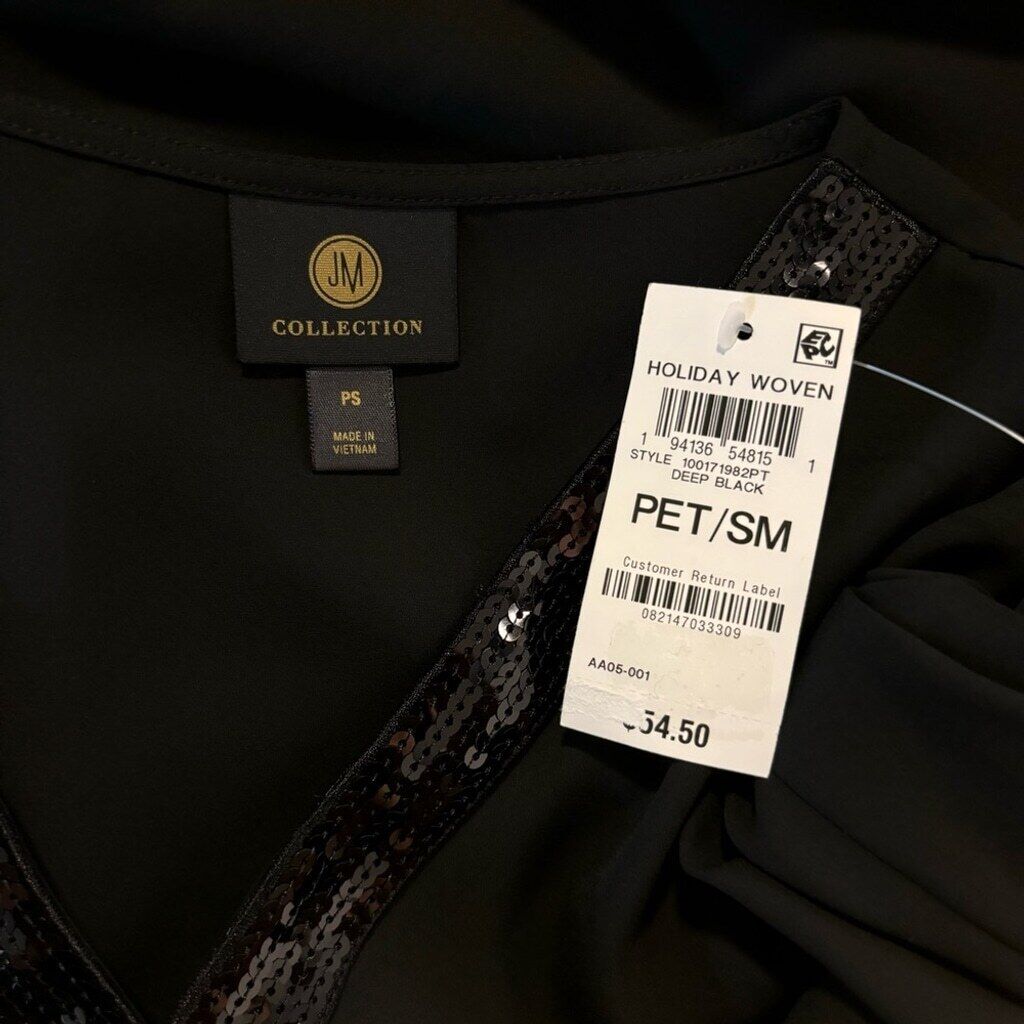 JM Collection Petite Small Black Sequined-Trimmed Y-Neck 3/4-Sleeve Top NWT