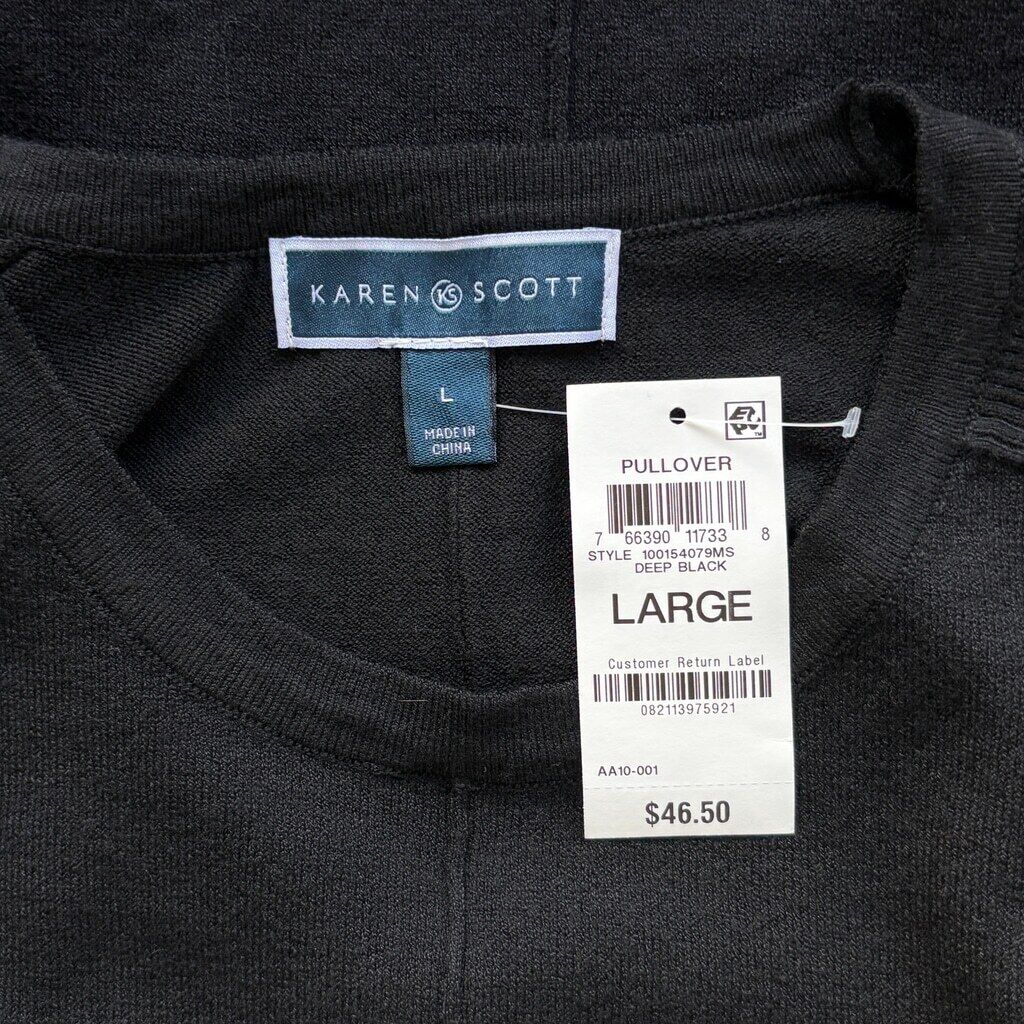 Karen Scott Women's Large Black Seam Front Knit Crewneck Sweater NWT