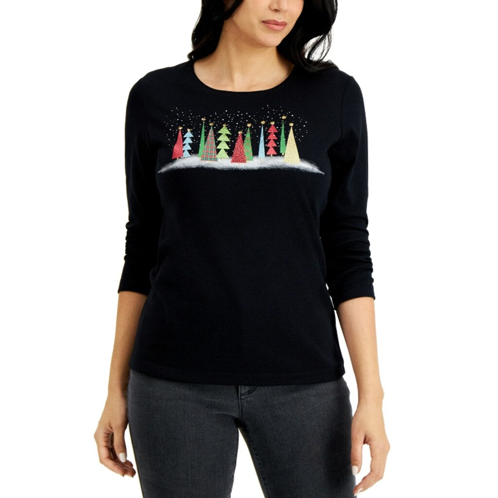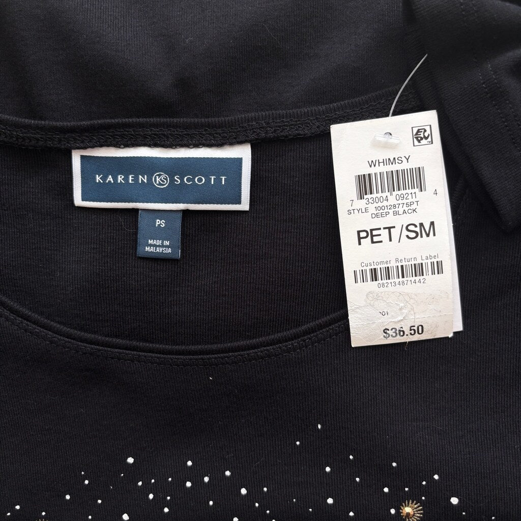 Karen Scott Women's Small Petite Black Embellished Holiday-Graphic T-Shirt NWT