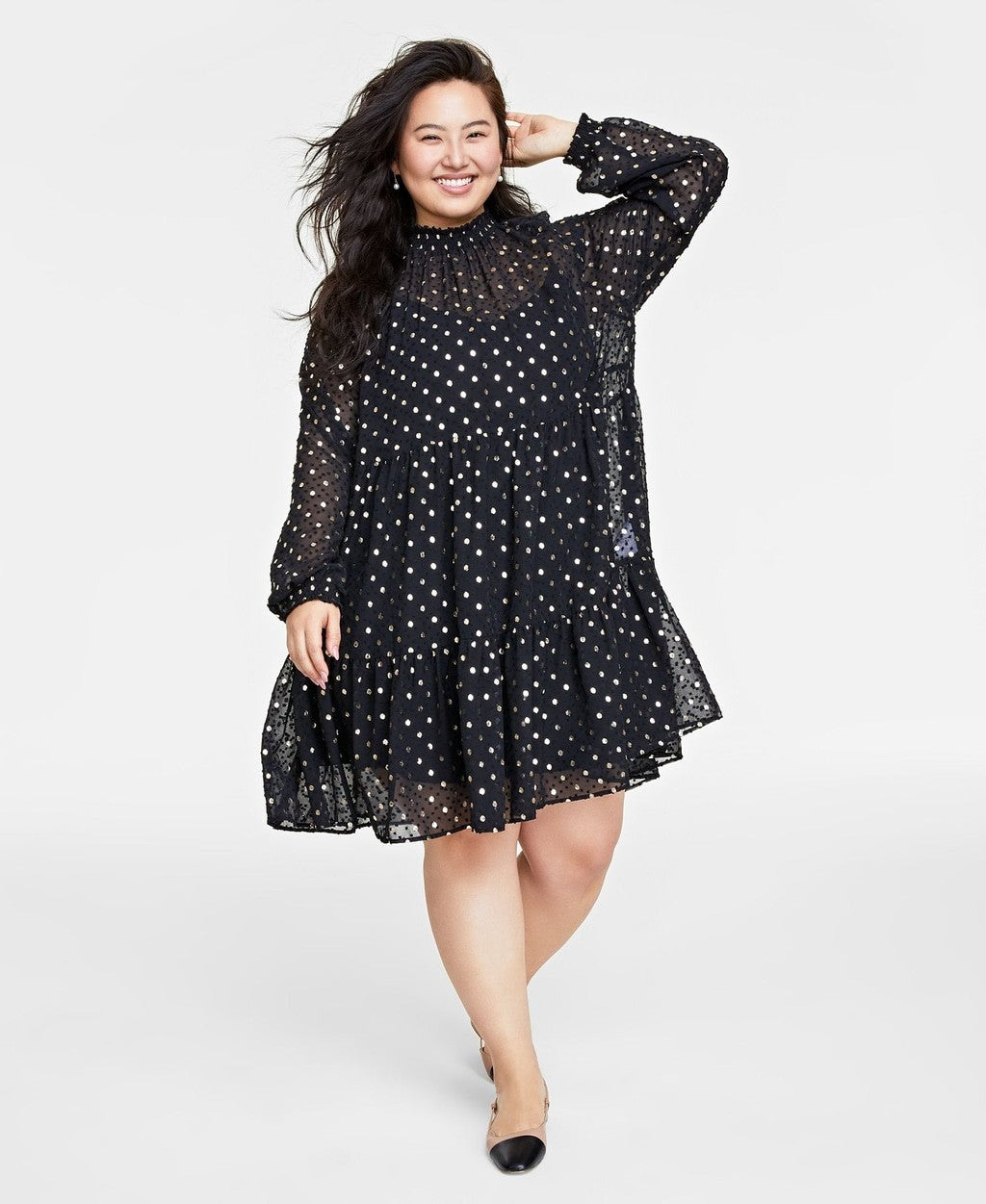 Chic and festive, this ON 34th tiered mini dress features shimmering gold metallic polka dots over sheer black fabric. Designed with a smocked mock neck, long sleeves, and a relaxed tiered silhouette — perfect for parties, date nights, or holiday gatherings.