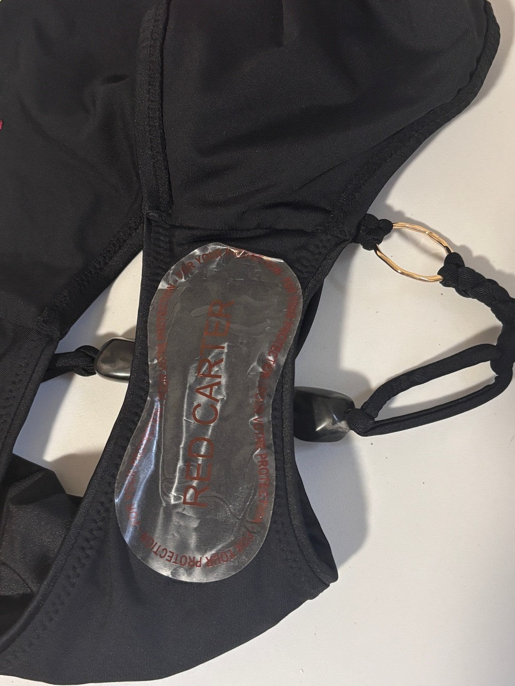 Red Carter black high-waist bikini bottom, new with tags. Features chic side bead and gold ring detailing, full coverage fit, and soft nylon-spandex stretch fabric for comfort. Includes hygiene protection liner still attached. Perfect for pairing with matching or mix-and-match swim tops.