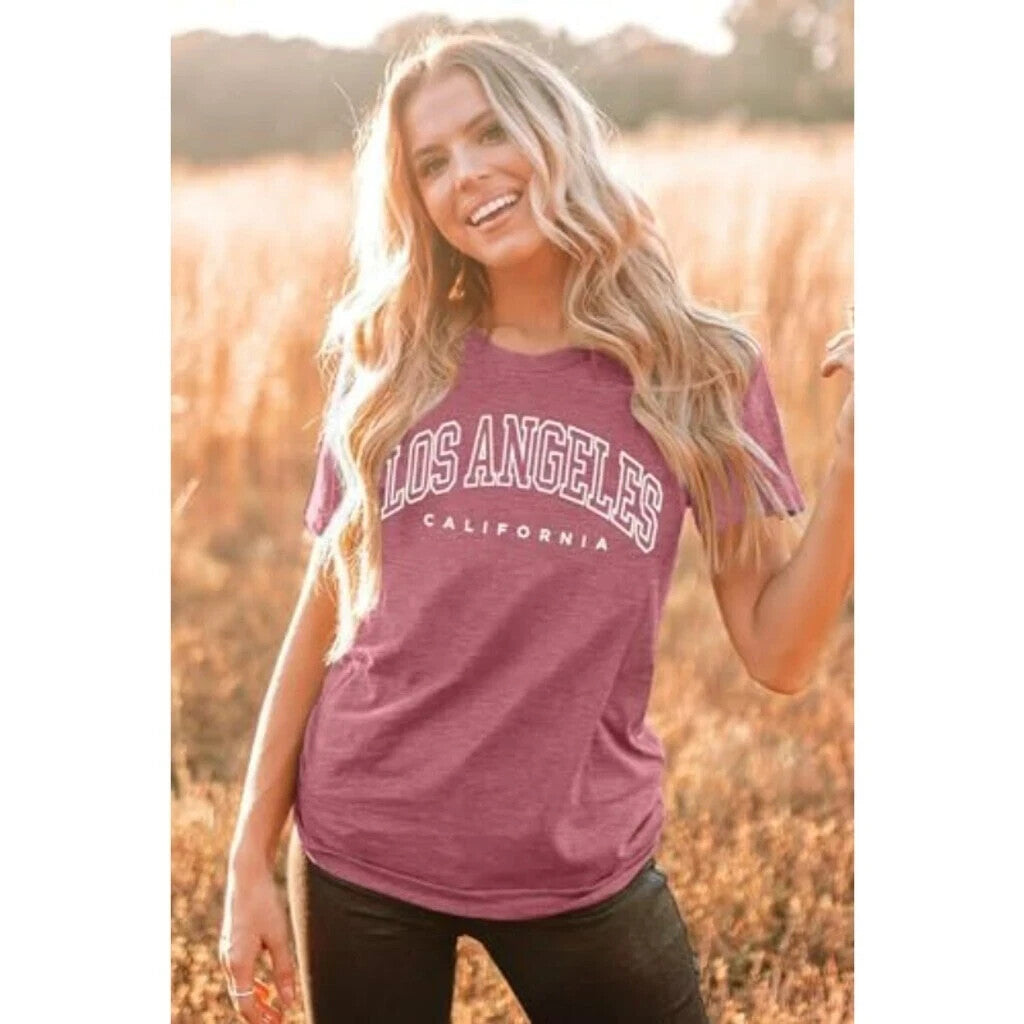 Soft and trendy, this SHEIN casual T-shirt features a bold Los Angeles California graphic on a light pink backdrop, perfect for relaxed everyday style.
