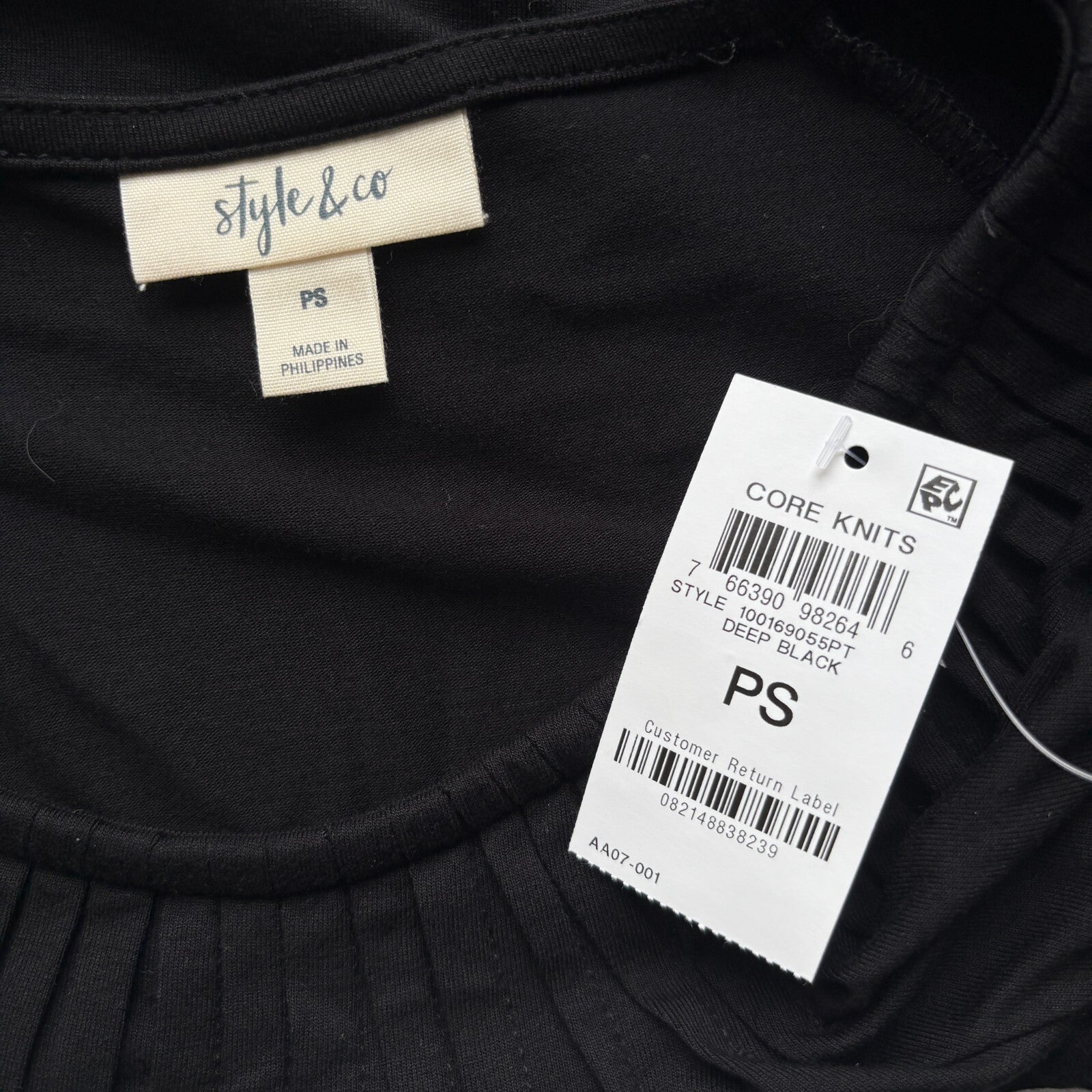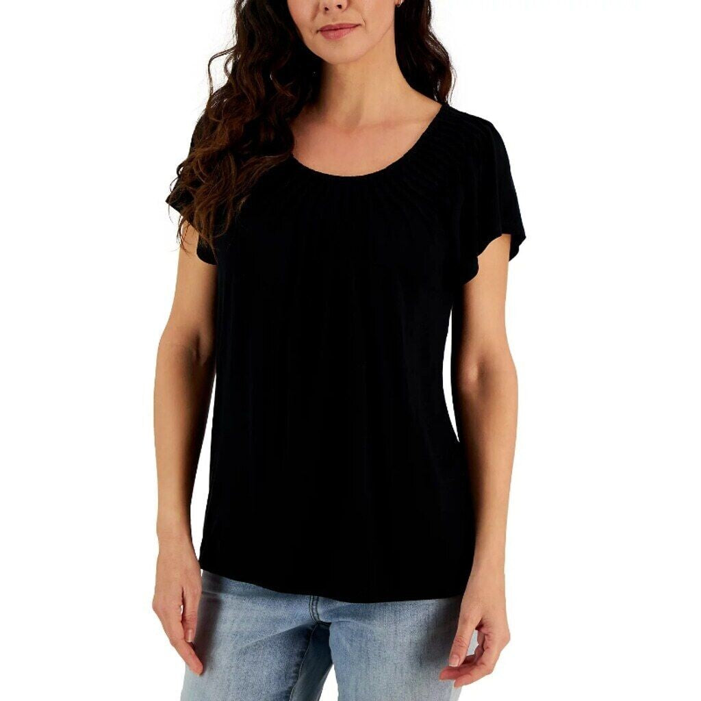 Style & Co Women's Petite Black Pleated Scoop-Neck Short-Sleeve Top NWT